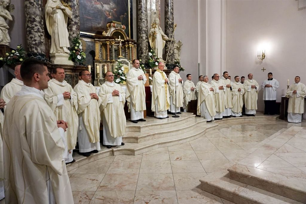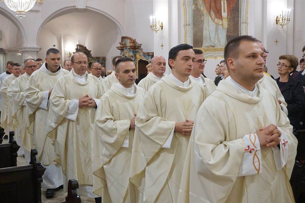 POŽEGA, 28. rujna 2019. – Na 22. obljetnicu uspostave Požeške biskupije te ređenja njezina prvog biskupa Antuna Škvorčevića, 27. rujna, kada se slavi i svetkovina posvete požeške Katedrale, zahvalno euharistijsko slavlje predvodio je u Katedrali biskup Antun u zajedništvu s kanonicima požeškoga Stolnog kaptola Sv. Petra, svećenicima djelatnima u središnjim biskupijskim ustanovama te u župama grada Požege. Uvodeći u sveto slavlje, biskup je podsjetio sudionike da je na današnji dan prije 22 godine Požeška biskupija počela svoj povijesni hod pod geslom «Krist danas i uvijeke!», kojemu smo prigodom spomena 20. obljetnice njezina osnutka pridodali riječi «naša nada«, i koje je u tako proširenom obliku otpjevano kao ulazna pjesma za ovo slavlje. Rekao je da želi zajedno s njima zahvaliti Bogu za dar Biskupije, kao i za sve ono što nam je tijekom minule dvadeset i dvije godine udijelio po njezinu služenju, osobito po vjernosti i požrtvovnosti svećenika i drugih vjernika koji su surađivali s biskupom na ostvarivanju Božjeg djela spasenja u Isusu Kristu. Pozvao ih je na molitvu da Bog snagom Duha Svetoga pomogne kako bi naš daljnji biskupijski hod bio u skladu s njegovim naumom, i da tako vjerno ostvarujemo svoje poslanje.