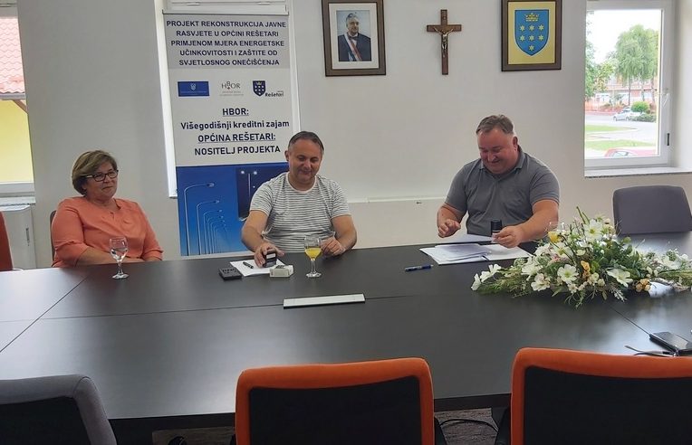 REŠETARI, 20. srpnja 2020. – U općinskoj vijećnici Općine Rešetari svečano je potpisan ugovor o modernizaciji javne rasvjete između Općine Rešetari i tvrtke ELEKTRO-CENTAR d.o.o., Đakovo. Ugovor su potpisali načelnik općine Rešetari Zlatko Aga i predstavnik tvrtke Elektro-centar d.o.o. gosp. Petar Prodanović, uz nazočnost gđe Milke Perković, predsjednice Općinskog vijeća Općine Rešetari i gđe Senke Vranić, vlasnice konzultantskog obrta Sintagma iz Nove Gradiške.