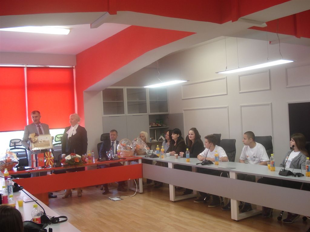 U petak 26. travnja u pratnji ravnateljice Dušanke Krstevske, gđe. Ljerke Toth Naumove i projektnog tima učitelja i učenika bili smo na prijemu kod načelnika općine Ilinden Žike Stojanovskog koji nas je pozdravio i zaželio nam srdačnu dobrodošlicu. Iskazao je zadovoljstvo projektom naših škola i uzajamnom suradnjom. Putem prezentacije predstavili su općinu Ilinden i Osnovnu školu „Goce Delčev“. Ravnatelj naše škole uručio je domaćinima prigodne poklone našeg načelnika, košare prepune domaćih slavonskih proizvoda i delicija, te u ime škole ručno izrađene slike od slame, knjige, majice s logom projekta, domaću rakiju i vino.