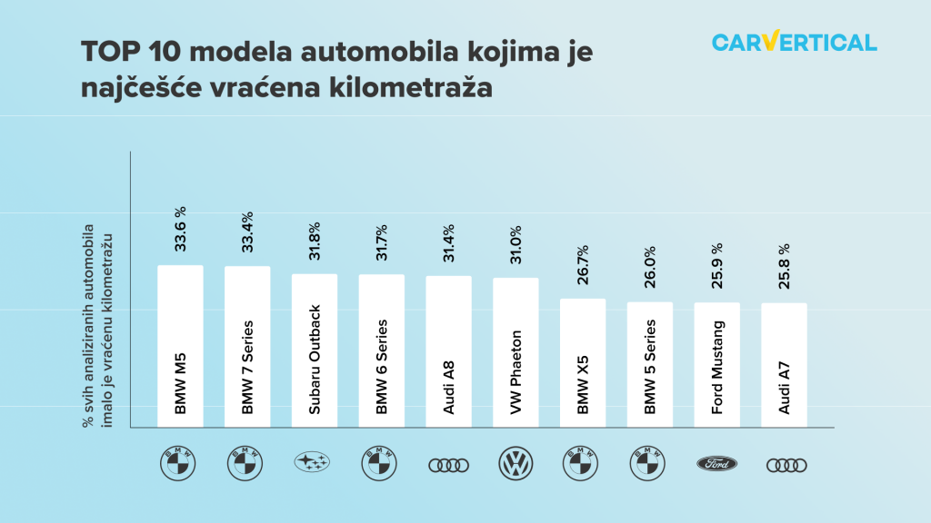 Kao što pokazuju podaci o kilometraži, BMW M5 je automobil s najčešće vraćenom kilometražom, s nešto više od trećine provjerenih modela za koje postoji mogućnost vraćene kilometraže. Međutim, sama ova statistika ne prikazuje dovoljno opseg problema BMW-ovih automobila s vraćenim odometrom – kao što je nedavno istaknuo Matas Buzelis, stručnjak za automobile u carVerticalu, BMW-ovi automobili dominiraju popisom: