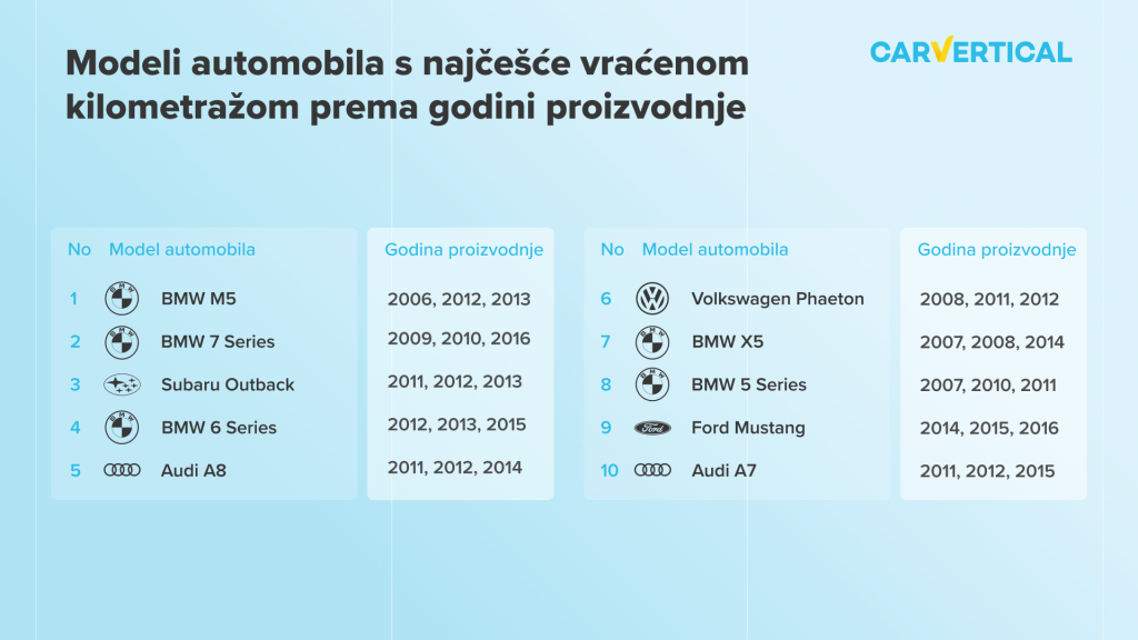 Da bi se odredio popis automobila kojima je najčešće vraćena kilometraža, IT tvrtka carVertical analizirala je više od 700 000 izvješća o povijesti rabljenih automobila generiranih između studenog 2020. i studenog 2021. godine. Analizirano je 18 različitih tržišta, uključujući Poljsku, Rumunjsku, Mađarsku, Francusku, Sloveniju, Slovačku, Češku, Litvu, Latviju, Estoniju, Ukrajinu, Bugarsku, Srbiju, Njemačku, Hrvatsku, Rusiju, Sjedinjene Američke Države i Italiju.