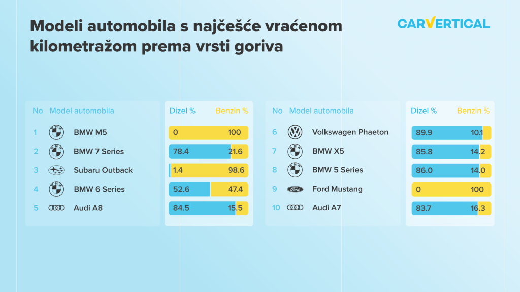 Modeli automobila s najčešće vraćenom kilometražom prema vrsti goriva: kilometraža se češće vraća dizelašima