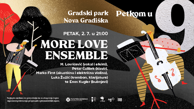 Pučko otvoreno učilište MAR  vas poziva na koncert sastava More Love Ensemble koji će se održati u petak 2. 7. u 21:00 u gradskom parku kod fontane. To je drugi koncert u sklopu manifestacije Petkom u 9 koja se  održava uz potporu Grada Nova Gradiška, Turističke zajednice Grada Nova Gradiška i Ministarstva kulture i medija RH.