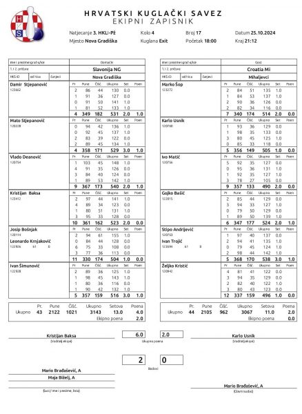 Nakon što je ekipa KK Slavonija NG u prošlom kolu uvjerljivo izgubila od ekipe KK Zanatlije SB II u Slavonskom brodu sa rezultatom 7:1 i razlikom u čunjevima 3351:3239,proteklog vikenda,25.10., pobijedila ekipu KK Croatiu Mihaljevce u 4.kolu 3.HKLI-Zona Požega i tako uzela nova dva boda na svojoj kuglani.