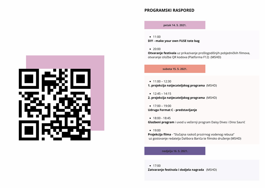 Prvi festivalski dan – petak 14. svibnja 2021. započinje programom DIY – make your own tote bag. Posjetitelji će moći otisnuti svoju FUSE platnenu torbu i iz prve ruke vidjeti proces sitotiska. Službeno otvaranje festivala bit će održano na Maloj sceni Hrvatskog doma s početkom u 20 sati. Nakon otvaranja uslijedit će projekcija pobjedničkih filmova trećeg izdanja festivala.