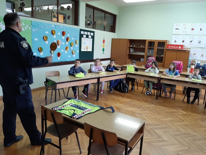 Obzirom da i prvih razreda po prvi puta u životu samostalno sudjeluju u prometu, poučio ih je o sigurnom kretanju i ponašanju u prometu, dajući im korisne savjete i upute. Također im je tom priliko poklonio prikladne poklone – svjetleće kabanice, kako bi bili što uočljiviji u prometu. U sklopu ovog zanimljivog i interaktivnog susreta, policajac Sudić je učenicima govorio o dijelu policijskog posla, pokazujući dijelove opreme i odore (policijsku kapu, stop palicu i kacigu), te objasnio čemu služe.