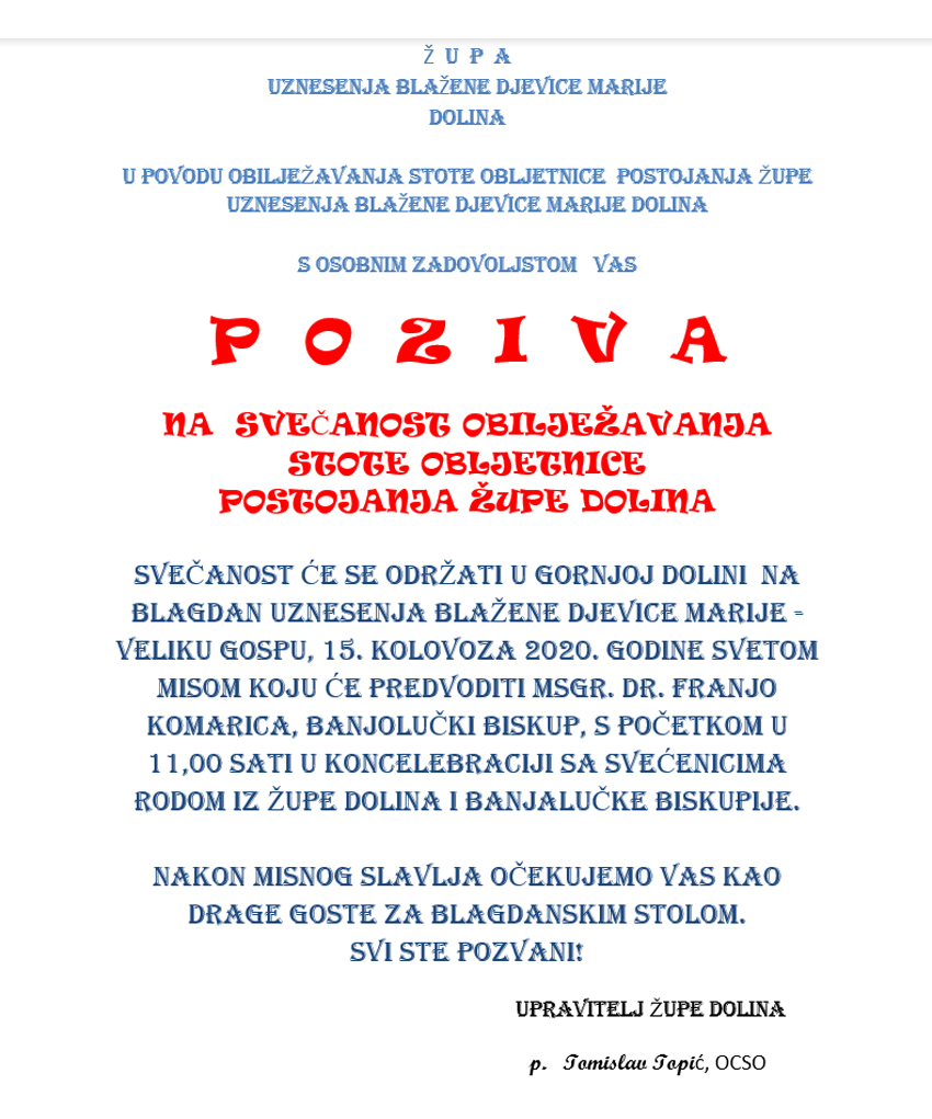 Upravitelj župe p. Tomislav Topić poziva župljane i sve Dolince koje je rat raselio po Hrvatskoj i diljem Europe da dođu u rodni kraj, uveličaju 100, obljetnicu župe i nakon mise se druže za blagdanskim stolom.
