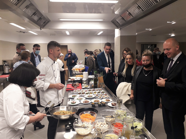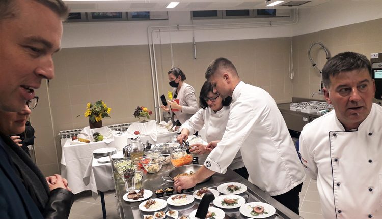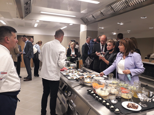 OSIJEK, 7. listopada 2021. – Regionalni centar kompetentnosti Ugostiteljsko-turistička škola otvorio je u četvrtak, 7. listopada 2021. godine suvremeni specijalizirani praktikum kuharstva i slastičarstva koji je realiziran preko projekta VIRTUS – Uspostava infrastrukture regionalnih centara kompetentnosti KK.09.1.3.01.0020. Novi praktikum nalazi se u suterenu škole i u potpunosti je obnovljen s izmjenom svih postojećih instalacija. U prostoru je postavljen kuhinjski blok s modernom opremom te amfiteatarsko gledalište s 24 mjesta. Služit će u nastavi, izvođenju pokaznih vježbi iz kuharstva i slastičarstva, za gostujuća predavanja domaćih i stranih gastronomskih stručnjaka te sve aktivnosti koje planira RCK.