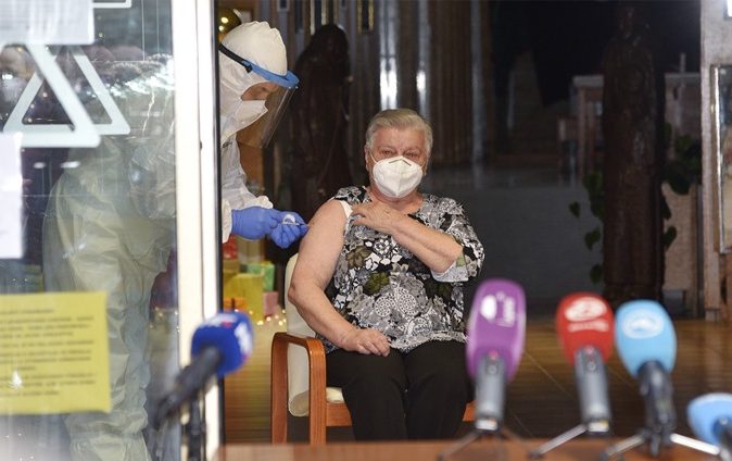 Slavonski Brod, 27. prosinca 2020. – Sedamdesetosmogodišnja Ruža Križ, korisnica Doma za starije i nemoćne u Slavonskom Brodu prva je osoba u Brodsko-posavskoj županiji koja se cijepila protiv virusa bolesti COVID-19. Kako je i ranije najavljeno, cijepljenje protiv COVID-a započelo je danas 27. prosinca, a prve doze namijenjene su najrizičnijim skupinama te zdravstvenim djelatnicima.