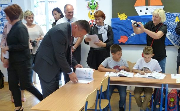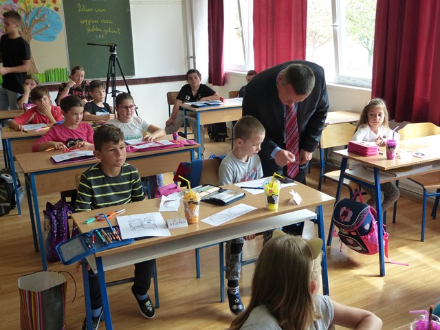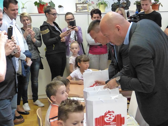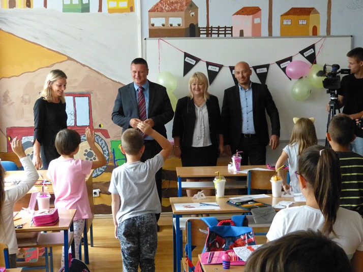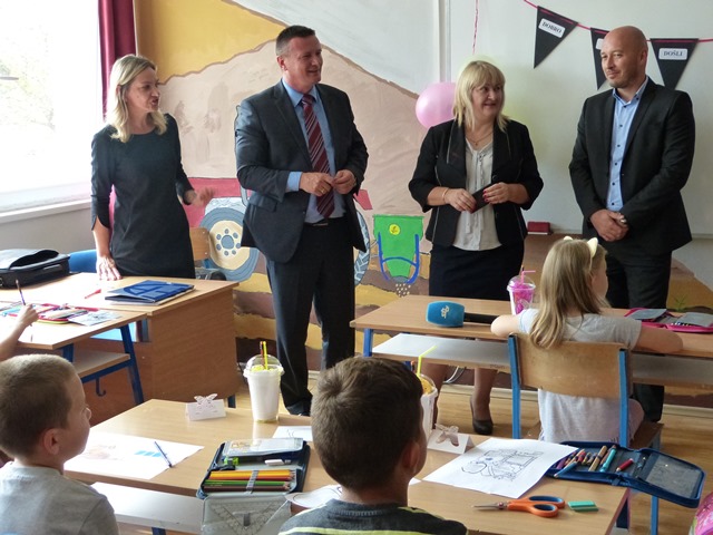 Cernik/Bebrina 3. rujna 2018. Prvog dana nove školske godine župan Danijel Marušić i njegovi suradnici već tradicionalno obilaze neke od škola Brodsko-posavske županije kako bi darivali prvašiće i poželjeli im uspjeh u daljnjem školovanju.