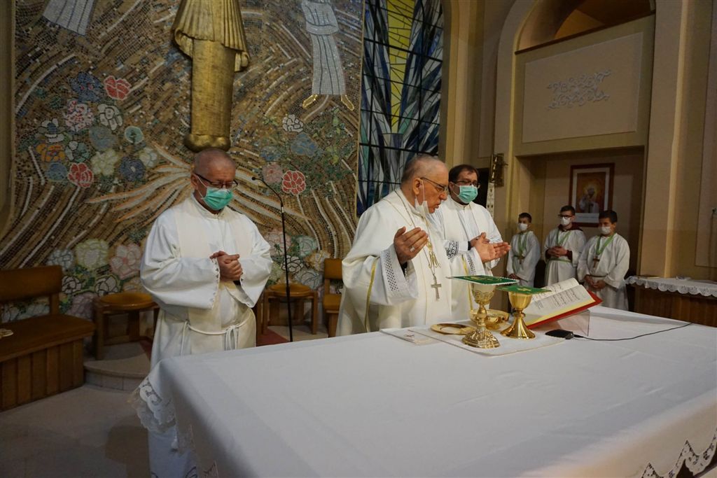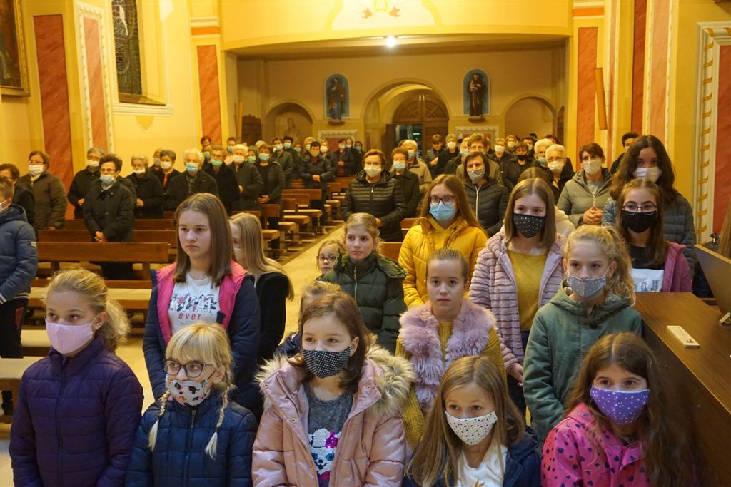 DAVOR – 7. studenoga 2020. – Na prvi petak u mjesecu, 6. studenog požeški biskup Antun Škvorčević pohodio je Župu Marije Kraljice i sv. Jurja Mučenika u Davoru te u župnoj crkvi tijekom euharistijskog slavlja krstio djevojčicu Iris, peto dijete Stjepana i Monike Matošević. Pozdravljajući koncelebrante – domaćeg župnika Maria Cimbala, novogradiškog župnika Branka Gelemanovića i tajnika Mateja Silukovića – časne sestre i druge sudionike slavlja, biskup je kazao da je prvi petak mjesečna postaja na kojoj se podsjećamo kako naš Bog nije bilo kakvo biće, nego biće srca – a gdje je srce, ondje je i život. Napomenuo je da se nalazimo u okolnostima pandemije u kojoj je život ugrožen, te je naglasio da nam rođenje novoga čovjeka svjedoči kako život pobjeđuje i usred najtežih životnih situacija po onim ljudima koji su poput Boga bića srca i ljubavi. Kazao je da želi zajedno s njima zahvaliti Bogu što nas voli, unatoč tome što pokatkad nismo dostojni njegove ljubavi. Zahvalio je obitelji Stjepana i Monike Matošević na njihovom petom djetetu, te im je od srca čestitao na njihovom opredjeljenju za život. Kad god se rodi novi čovjek, pojavilo se Božje djelo, ustvrdio je biskup. Pozvao je sudionike slavlja da u ovu svetu misu uključe nedavno preminulog svećenika Marijana Đukića, koji je deset godina bio njihov župnik, i povjere ga milosrdnoj Božjoj ljubavi, da ga obdari puninom vječnog života za sve dobro koje je i ovdje u Davoru nastojao činiti.