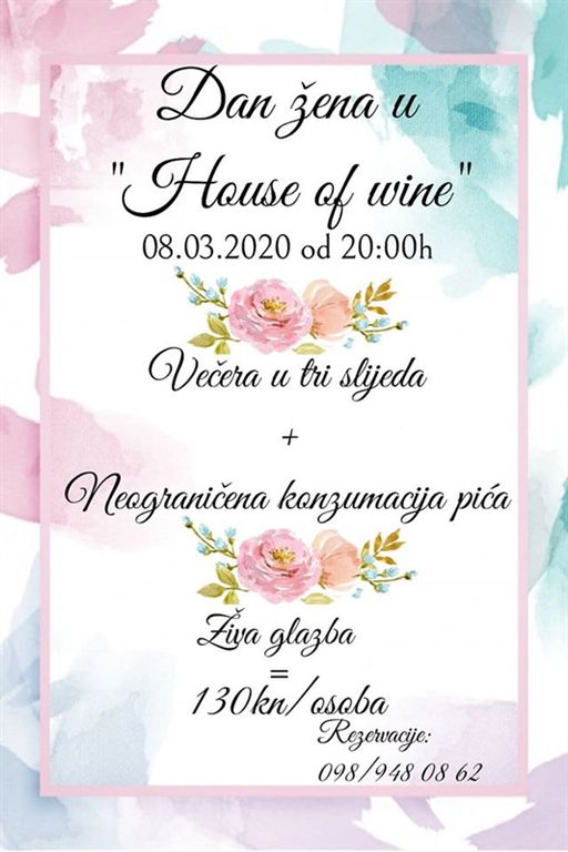 Prva prilika čeka već 8. ožujka, stoga, želite li svojoj boljoj polovici čestitati na pravi način, uz večeru u tri slijeda, neograničenu konzumaciju pića, živu glazbu i sjajnu atmosferu, na vrijeme nazovite broj 098/948 0862. Mjesto po mjeri gosta čeka. Dobro došli u House of wine!