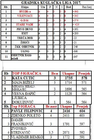 NOVA GRADIŠKA -Odigrano je 4. Kolo Gradske kuglačke lige . U ovom kolu je bilo i napetosti i to do završetka utakmice u derbiju između EXITA i VILENJAKA ali su Vilenjaci sa 11 čunjeva zasluženo pobjedili , U ovom kolu od pojedinki najbolji rezultat je imala Maja Biželj sa 593 oborena čunja, dok su od pojedinaca odlično odigrali te rezultate preko 600 čunjeva postigli čak sedam igrača Zdenko Poleto sa 619 oborenih čunjeva.Damir Nikić 610,Zvonko Strinavić 610,Vladimir Bemko 607,Željko Zboril 604,Tomislav Biželj 603, Pavle Filipović 602.Vrh tablice i dalje drže neporaženi HVIDR-a i VILENJACI.
