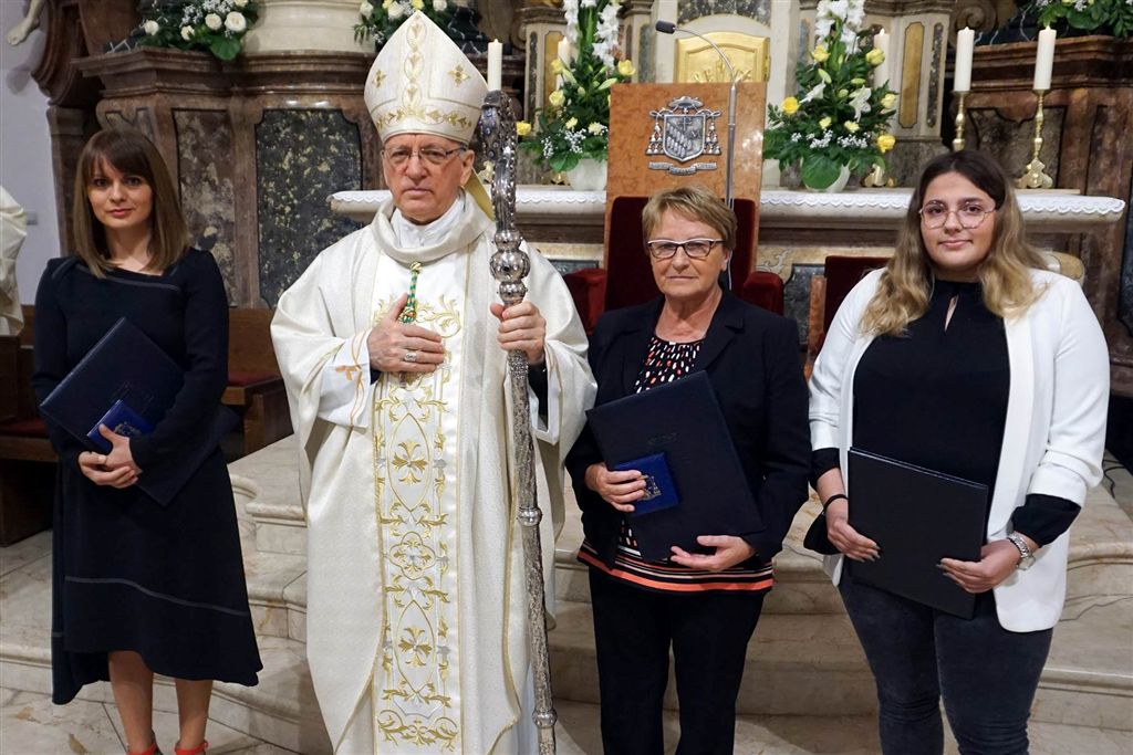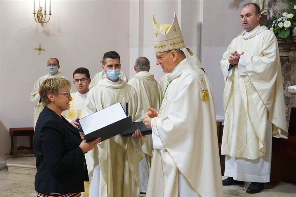 Nakon popričesne molitve sudionici slavlja otpjevali su himan «Tebe Boga hvalimo» i molitvu za Požešku biskupiju, koja je zaključena pjevanjem biskupijskog gesla »Krist danas i uvijeke, aleluja!«. U ime svećenika, đakona, redovnika i redovnica, članova Stolnog kaptola te nazočnih vjernika biskupu Antunu spomenute obljetnice čestitao je generalni vikar Josip Krpeljević, a učenici požeške Katoličke osnovne škole uručili su mu cvijeće. Biskup je sudionicima slavlja zahvalio na čestitci, a osobito na molitvama, rekavši kako i on za njih moli Gospodina da ih u zajedništvu svoje Crkve neprestano hrabri, međusobno povezuje, utvrđuje u onome što je njegovo i uzdiže u onu stvarnost koju nam je svojom mukom, smrću i uskrsnućem pripravio. Zahvalio je svojim najbližim suradnicima i svima drugima koji mu pomažu u vršenju biskupske službe. Potom je biskup Antun zaslužnim vjernicima Požeške biskupije uručio biskupijske medalje s Poveljom zahvalnosti: Febroniji Ančić iz Župe sv. Antuna Padovanskog u Daruvaru; Marijani Ćorluka, profesorici hrvatskog jezika u Katoličkoj gimnaziji u Požegi i Ani Matković, voditeljici Biskupijskog centra „Pro vita et familia“ i psihologinji u Katoličkoj osnovnoj školi u Požegi.