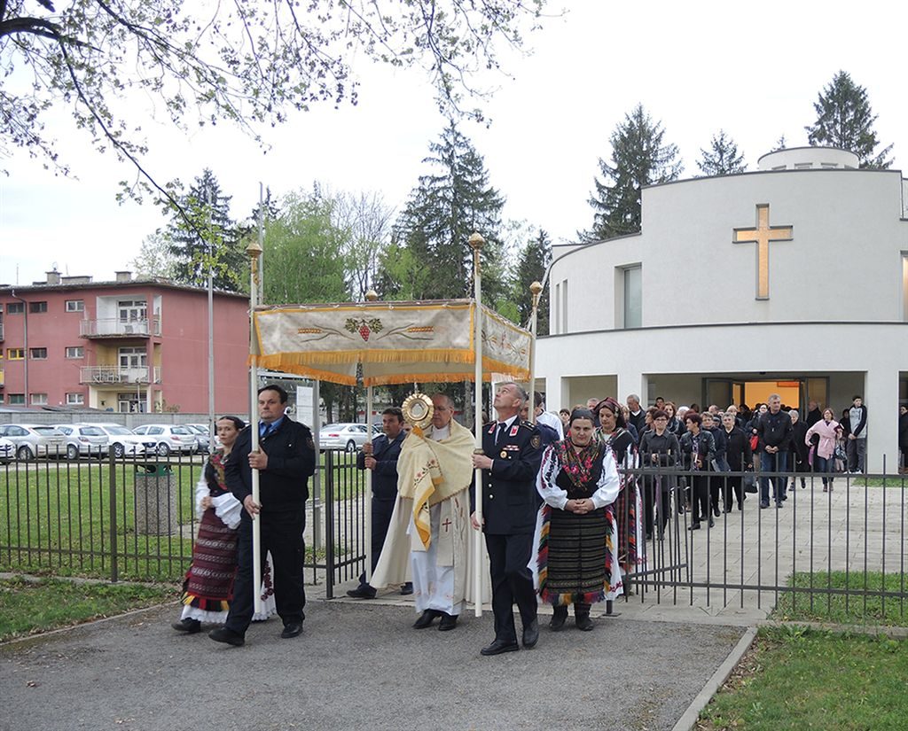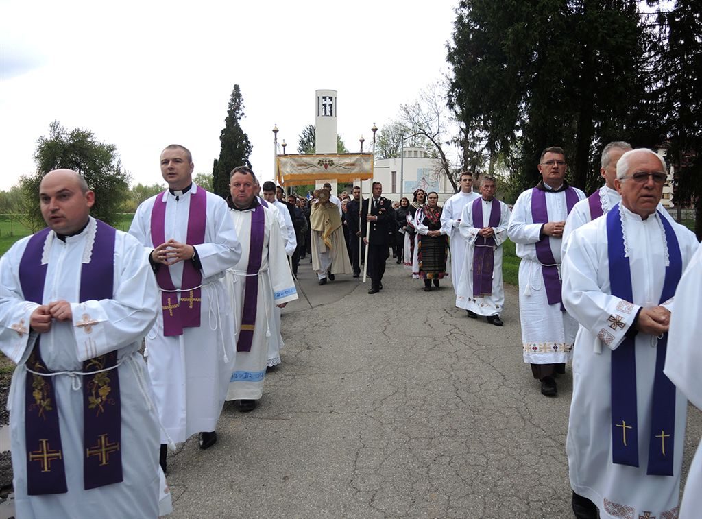 Nakon popričesne molitve oblikovana je procesija s Presvetim Oltarskim sakramentom, u kojoj su uz brojne vjernike sudjelovali predstavnici kulturno-umjetničkih društava odjeveni u narodne nošnje, vatrogasci, predstavnici Hrvatske vojske i školska djeca. Euharistijska procesija zaustavila se na ulazu u starogradiški zatvor gdje je održana molitvena postaja, gdje je biskup spomenuo svu znakovitost ovog čina, u kojem se s Isusovom žrtvom sjedinjuju svi vapaji, poniženost i žrtva nedužnih uznika koji su ulazili u ovaj logor. Dodao je kako su brojni svećenici u ovom zatvoru čeznuli da mogu primiti svetu pričest te se kriomice uz veliku opasnost pokatkad slavili svetu misu i da se naše javno očitovanje vjere u Isusa Krista u ovoj procesiji sjedinjuje s njihovim svjedočenjem skrivenim u srcu i u žrtvi koju s podnosili. Još je pripomenuo kako nas krov koji propada na zatvorskoj zgradi podsjeća na polagani zaborav na ljude koju se ovdje žrtvovali, ali da naša molitva i procesija svjedoči kako će oni biti sačuvani u našem spomenu na njih. Po povratku procesije u crkvu, Isusu Kristu upućeni su poklici koje su mu izricali pojedini ljudi kako je zapisano u Evanđelju, te svima nazočnima podijeljen euharistijski blagoslov. Na slavlju je pjevanje predvodio župni zbor sv. Cecilije iz Davora, a među ostalima sudjelovali su i ministranti iz župa Novogradiškog dekanata.