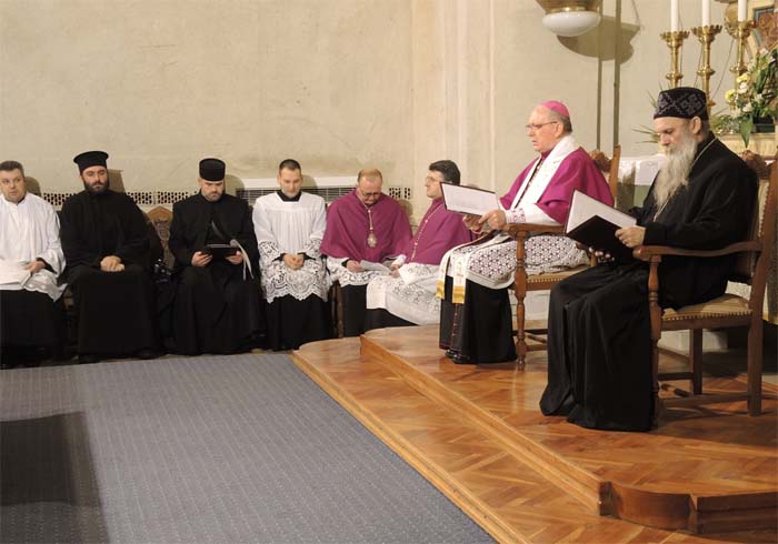 Nakon naviještenih svetih čitanja prvi je progovorio biskup Antun. Istaknuo je da je »silno znakovito što smo večeras zajedno, jer svjedočimo – i mi katolici i braća pravoslavni – da vjerujemo Bogu i njegovu djelu ostvarenu u Isusu Kristu«. Istaknuo je da o tom djelu govori apostol Pavao u naviještenom ulomku iz Druge poslanice Korinćanima kad kaže da je Bog u Isusu Kristu svijet sa sobom pomirio, a da smo mi kršćani kao Kristovi poslanici pozvani pomiriti se s Bogom i međusobno. Podsjetio je da postoji teška činjenica podjela u nama samima, u našim obiteljima, među narodima i među Isusovim crkvama. »Što treba činiti pred tim podjelama?«, zapitao je biskup, odgovorivši da si »uvijek iznova trebamo posvješćivati kako Bog nije ostao ravnodušan pred tim stanjem, nego je u Sinu svome Isusu Kristu poduzeo najveći pothvat, utjelovljenjem ušao u našu ljudsku stvarnost ranjenu zlom i podjelama, da bi nas pomirio sa sobom i s nama samima«. A to je učinio, nastavio je biskup, tako što »nije pripovijedao o našim zloćama, nemoćima i pokvarenostima, nego što je tim našim stanjima nemoći pristupio svojim najmoćnijim sredstvom – ljubavlju i praštanjem, jedino kadrim izliječiti ono što je podijeljeno i ranjeno«.