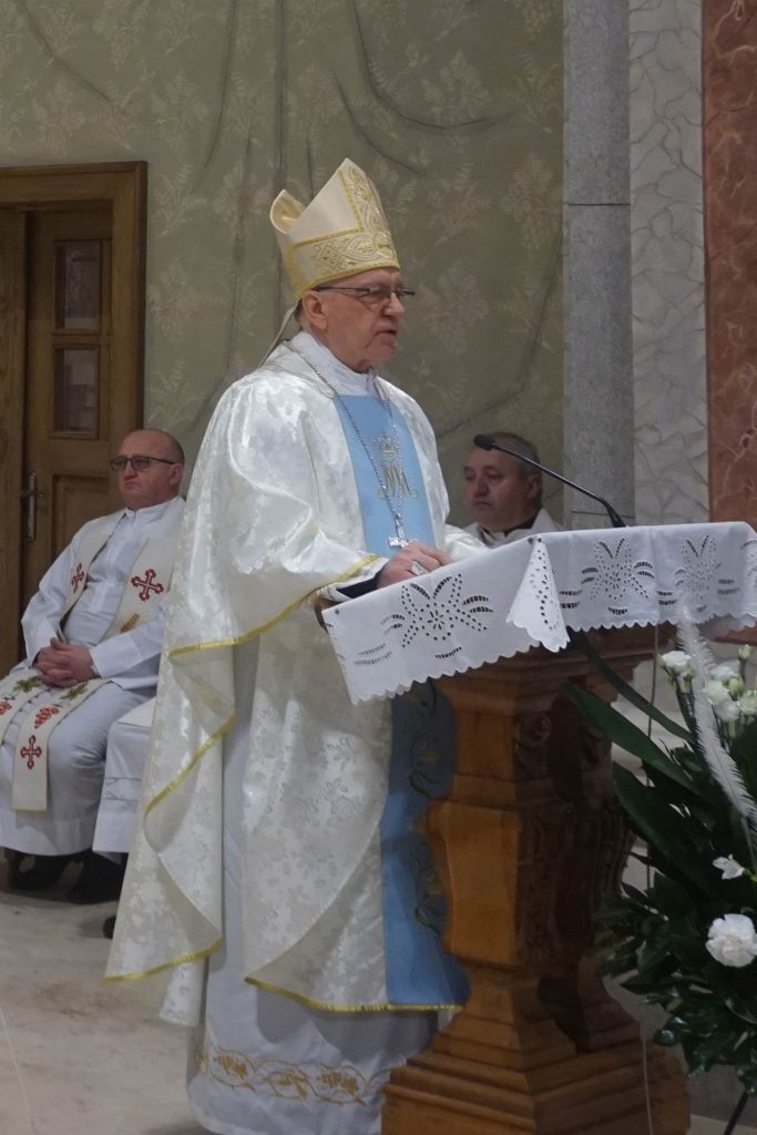 U homiliji biskup je kazao kako bi nam naziv »Bezgrješno Začeće Blažene Djevice Marije« u prvi mah mogao usmjeriti misli na grijeh kao središnju poruku današnje svetkovine, a ona nas uvodi u daleko dublju stvarnost. Podsjetio je da nam je svima iskustveno poznato kako postoji određena ljudska ranjenost zlom i negativnošću, koja prethodi našem rođenju i koju nazivamo istočni, ili bolje rečeno iskonski grijeh. K tome, svaki pojedini čovjek svojim osobnim slobodnim opredjeljenjima za ono što je zlo i negativno doprinosi da to opće stanje ranjenosti čovječanstva postane još mučnije i teže, istaknuo je biskup. Upozorio je na svojevrsnu atraktivnost zla, koja se očituje i u činjenici da se suvremeni mediji svakodnevno u najvećoj mjeri usredotočuju na ono što je zlo i negativno u pojedinim osobama i društvu te da ono čini vijest, više nego li sve drugo. Zlo je izazovno, štoviše zarazno. Ono nas uključuje u svoj krug i u svoju igru i time što svaku večer gledamo i slušamo koliko je toga dana zločestoga rečeno i učinjeno u Hrvatskoj i u svijetu, i mi to onda jedni drugima dalje prepričavamo. Što će nam priča o zlu, kad je ono i bez nje dovoljno teško, kazao biskup. Poručio je sudionicima slavlja da se nisu danas okupili u svoju župnoj crkvi da bi slušali o zlu, grijehu i negativnosti, nego da bi usred svijeta zla i negativnosti čuli radosnu vijest, koja je odjeknula već u prapočecima čovječanstva, kako nam je naviješteno u ulomku prvog čitanja iz Knjige postanka.  Pred činjenicom zla, koje je provalilo u njegov život, iznenadilo ga i prevarilo, postavši sastavnim dijelom njegova postojanja čovjek je očitovao svoju nemoć. No, Bog ga nije napustio u tom stanju, nego je smislio projekt i pripremio sredstva kojim će ga osloboditi. Zmiji, simbolu Zloga, Bog je dao do znanja da ne ostaje ravnodušan pred zlom u koje je čovjek upao, nego uspostavlja neprijateljstvo između nje i žene, između nje i ženina potomstva i u toj će borbi čovjek biti pobjednik, ustvrdio je biskup. Kazao je kako se to obećanje počelo ostvarivati u dijalogu između Božjeg glasnika anđela Gabrijela i nazaretske Djevice Marije, koji sv. Luka donosi u evanđeoskom prizoru navještenja. Bog je začećem svoga Sina u Mariji po Duhu Svetom i rođena po tijelu u našoj slabosti, prolaznosti i smrtnosti, njegovom mukom i smrću, snagom božanske ljubavi oduzeo moć grijehu i smrti. Biskup je dodao kako o toj moći Božje ljubavi koja je ubojita za grijeh i smrt, govori apostol Pavao kad nas u ulomku drugog čitanja iz poslanice Efežanima uvjerava da nas je on u Isusu Kristu blagoslovio svakim blagoslovom, nebeskim i zemaljskim, da nas je u njemu izabrao i pozvao u puninu života. Stoga je temeljna radosna vijest koju na slavlju ove svetkovine treba navijestiti da je Marija posebna izabranica u Isusu Kristu da bismo u njemu i mi svi bili izabranici Božji. Izabrao nas je sâm Bog i zajedno s nama korača ovim svijetom. Marija je primjer osobe koja je sva živjela od svijesti da je Božja izabranica, te je zauzeto, dosljedno i vjerno surađivala s njime u ostvarivanju njegova spasenjskog nauma u Sinu svome Isusu Kristu.