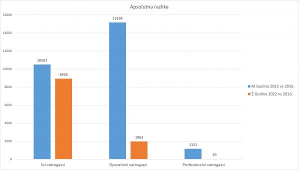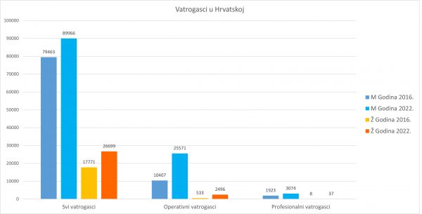 Kada uspoređujemo razliku između ove i 2016. godine, tada je vidljivo kako je broj muškaraca u proteklih šest godina na ukupni broj muškaraca i žena u vatrogastvu povećan za 13% , a žena 50%. U kategoriji operativnih vatrogasaca broj vatrogasaca povećao se gotovo 2.5 puta, dok se broj vatrogaskinja povećao skoro 5 puta. U profesionalnom vatrogastvu zabilježen je značajan rast pa je tako kod vatrogasaca došlo do porasta za gotovo 60%, dok se broj profesionalnih vatrogaskinja učetverostručio. Ukratko, u hrvatskom vatrogastvu žene čine gotovo 23%, što je u odnosu na 2016. godinu kada je udio žena iznosio 18% vidljiv porast. Također, i u operativnom vatrogastvu je broj vatrogaskinja narastao sa 5% na 9%, a u profesionalnom vatrogastvu s 0,41% na 1,19%.