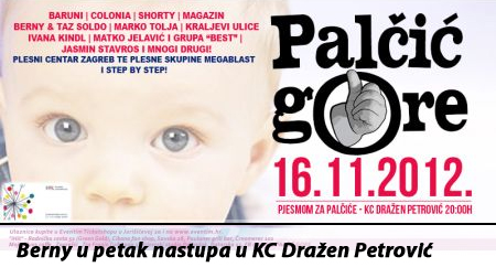 Ovoga petka 16.11. KC Dražen Petrović u Zagrebu biti će domaćin velike nacionalne humanitarne akcije “Palčić gore”. Od 20h na stage-u odnosno uživo na HRT1 publiku će zabavljati najpoznatija imena estrade Jasmin Stavros, Magazin, Shorty, Ivana Kindl, Kraljevi ulice, Matko Jelavić, Marko Tolja ali i nova zvijezda estrade Berny koji je publiku diljem zemlje osvojio pjesmom “Udala se nikad’ nije”.