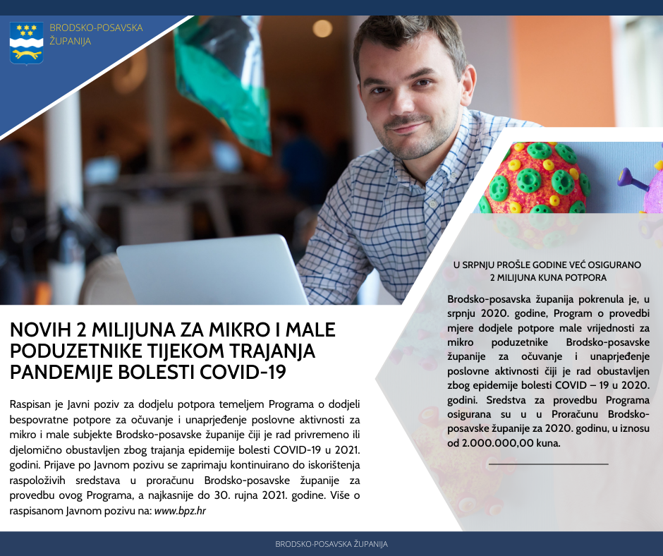 • Program o odjeli bespovratne potpore za očuvanje i unaprjeđenje poslovne aktivnosti za mikro i male subjekte Brodsko-posavske županije čiji je rad privremeno ili djelomično obustavljen zbog trajanja epidemije bolesti COVID-19 u 2021. godini;