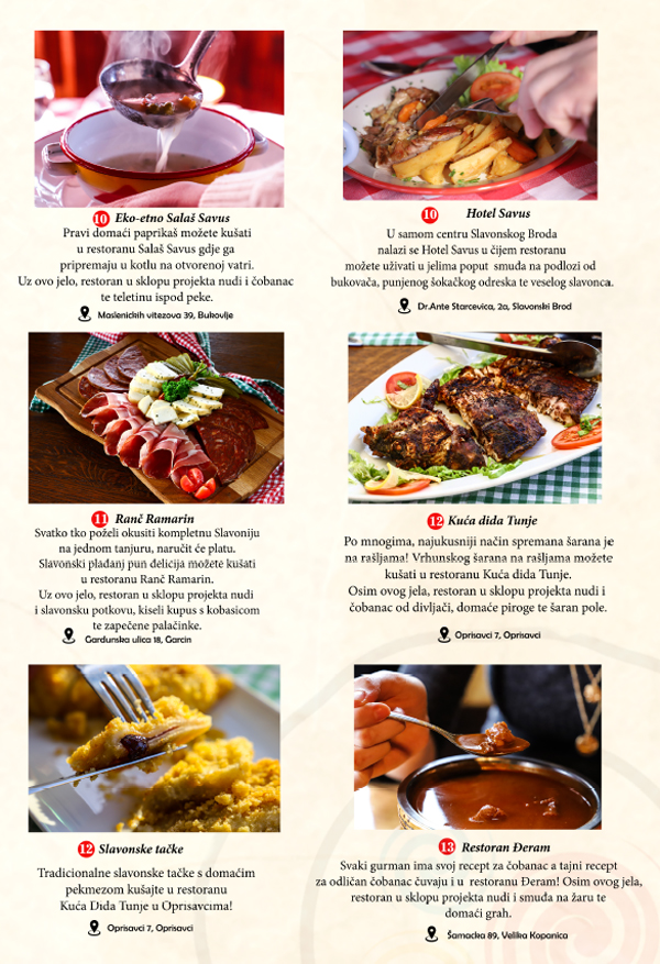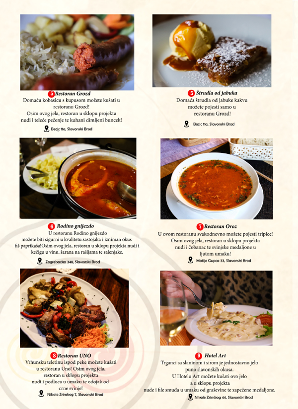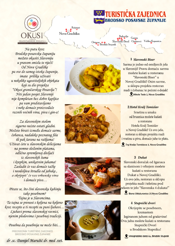 TZ Brodsko – posavske županije je pod nazivom “Okusi graničarskog posavlja” u projekt do sada uključila 15 restorana iz cijele županije. Interes su iskazali i drugi restorani iz Brodsko – posavske županije. Ideju o brendiranju eno- gastro ponude smo pokrenuli u rujnu 2017. godine, imajući u vidu da je gastronomija važan dio identiteta pojedinog kraja ali je i sve značajniji motiv za putovanje, kao i bitan element ocjene ukupnog zadovoljstva gosta destinacijom. U oblasti eno- gastronomskog turizma cilj nam je bio ujediniti poljoprivredu, gastronomiju, enologiju i kulturu koji su važan dio održivog razvoja destinacije.