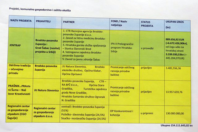 U ovom trenutku u provedbi ili pripremi je čak  26 projekata. U području komunalnog gospodarstva i zaštite okoliša aktualna su 4 projekta ukupne vrijednosti preko 154 milijuna kuna, a u gospodarstvu je ukupna vrijednost aktualnih projekata više od 170 milijuna kuna.  Zamjenik župana Bošnjaković pobliže je predstavio svaki od ovih osam projekata. O projektima iz domene društvenih djelatnosti i zdravstva više  informacija pružio je zamjenik župana Mirković, te istaknuo ogromnu brigu koja se poklanja ulaganju u mlade i njihove potrebe, te nastojanju poboljšanja opće klime za napredak i obrazovanje mladih.  Ukupna vrijednost projekata iz školstva i kulture iznosi preko 91,6 milijuna kuna.  U zdravstvenoj se zaštiti planira velika ulaganja kroz 9 projekata, ukupne vrijednosti preko 130 milijuna kuna.  Projekti obuhvaćaju sve razine zdravstvene zaštite, a odnose se i na opremanje objekata, nabavu opreme, ali i ulaganje u edukaciju djelatnika.